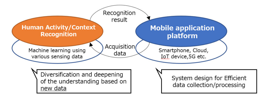 We are focusing on human activity/context recognition using various information that can be obtained from a smartphone and its surrounding environment. The understanding is a key factor to develop advanced services that are optimal for each person. Also, we are focusing on the system design issues to realize such services.