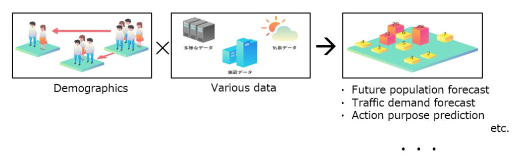 By capturing demographics in a wide area, and combining them with various data, it enables to predict people’s activities or state in the future, such as future demographics, traffic demands, and so on. Based on such technologies, we propose new services that contribute to the revitalization of the local society and economy.