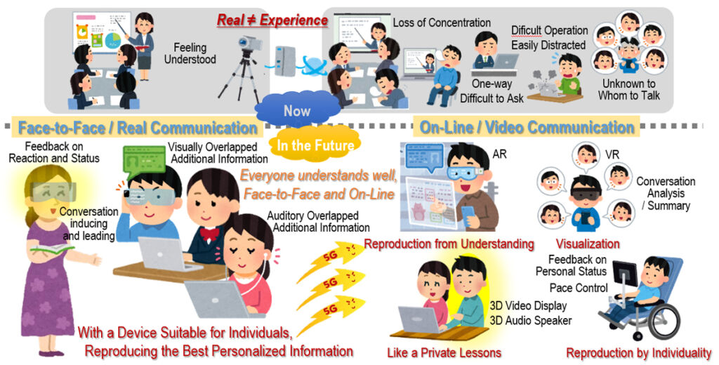 Audio-visual information is the most important interface in human communication. Using 3D audio-visual technology and HCI(Human-Computer Interaction) technology, our research project will realize the ultimate communication system that goes beyond reality and naturally connects people by the expressing intention, mind and sympathetic response. In particular, we will research next-generation communication methods intervening the communication system that are widely effective in both face-to-face and on-line communication, such as being able to speak naturally while feeling the atmosphere and being aware of the comprehension.